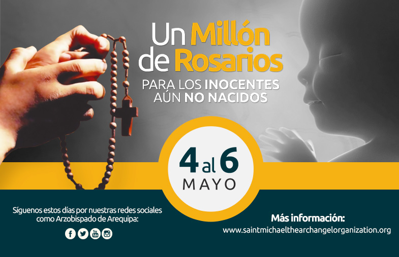 Desde hace varios años, la Organización de San Miguel Arcángel en Estados Unidos fomenta una gran iniciativa a nivel mundial, bajo el nombre «Un millón de Rosarios para los inocentes aún no nacidos». Este año, la Arquidiócesis de Arequipa se unirá a esta gran cadena de oración, que iniciará el viernes 4 de mayo y culminará el domingo 6 del mismo mes. La convocatoria es para todos: niños, jóvenes, adultos, familias, sacerdotes, religiosas, seminaristas y todo aquel que desee sumarse a este bonito momento en el que el mundo entero unirá sus voces en defensa de la vida y la familia, a través de la oración.