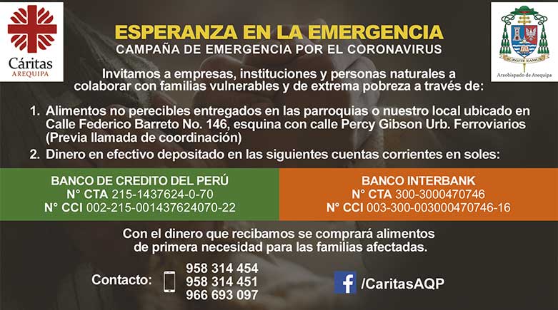 Mons. Javier Del Río Alba, Arzobispo de Arequipa, anunció una campaña de recolección de alimentos no perecibles, bajo el lema: "Esperanza en la emergencia". La campaña busca ayudar a las familias de bajos recursos económicos que, al no poder salir de casa por la pandemia del Covid-19, se ven sumamente afectadas y empiezan a pasar por extrema necesidad.