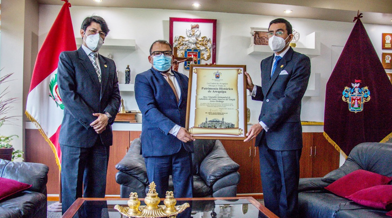 La Municipalidad Provincial de Arequipa otorgó el título de Patrimonio Histórico de Arequipa a la “Muy Venerable Hermandad de Caballeros del Santo Sepulcro del Templo de Santo Domingo”, con motivo del 150° aniversario de su fundación. El Alcalde Provincial, Mg. Omar Candia Aguilar, entregó el pergamino y la respectiva resolución a los señores Roberto Lazo y Raffo Chávez, Mayordomo y Tesorero de la Hermandad, quienes asistieron al acto en representación de su Junta Directiva y los demás hermanos.