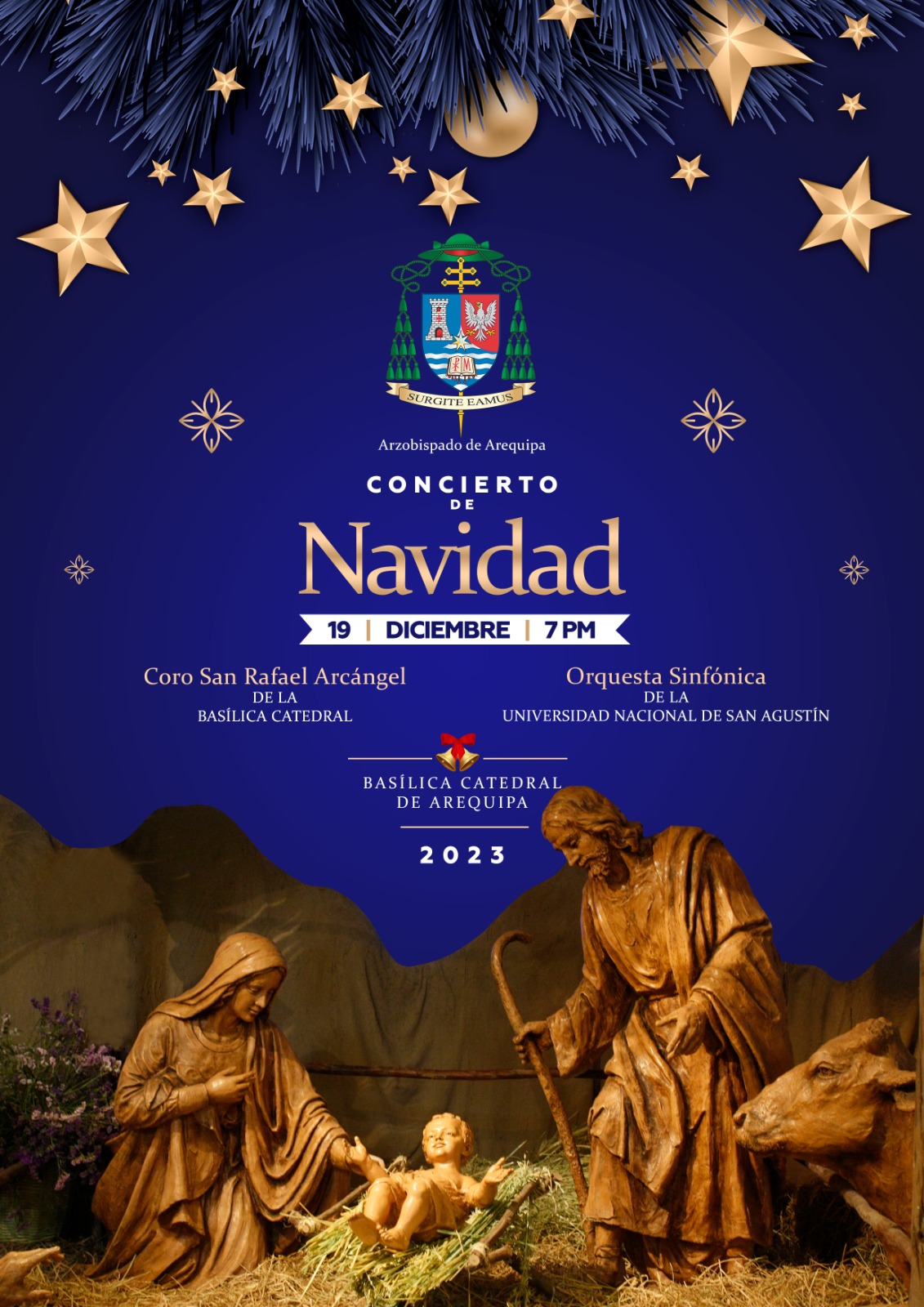 Este martes 19 de diciembre, las celebraciones navideñas en la Arquidiócesis de Arequipa comenzarán con el Coro de Niños “San Rafael Arcángel” de la Basílica Catedral y la Orquesta Sinfónica de la Universidad Nacional de San Agustín - UNSA, quienes ofrecerán un Concierto de Navidad en la Catedral. El espectáculo musical iniciará a las 7 p.m. y el ingreso será completamente gratuito.