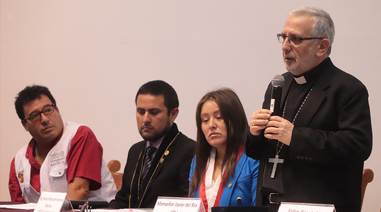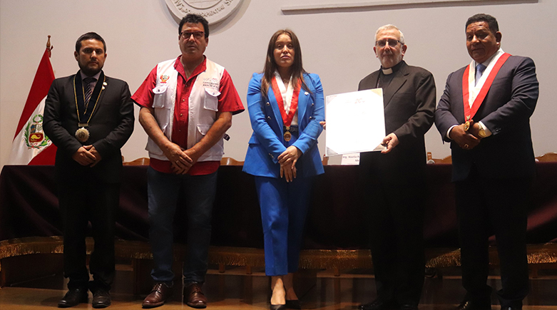 La condecoración se realizó el viernes 9 de febrero, al finalizar la Mesa de Trabajo sobre prevención del acoso escolar y promoción de la convivencia sin violencia en las instituciones educativas, convocada por la congresista de la República Srta. Noelia Herrera Medina, autora de la Ley N° 31902 que trata sobre ambas materias. A pedido de la misma congresista, Mons. Del Río tuvo a su cargo introducir la Mesa de Trabajo que se desarrolló en el Aula Magna “Simón Bolívar” de la Universidad Nacional de San Agustín (UNSA). Brindó también algunos aportes a partir de la Doctrina Social de la Iglesia y del reciente Magisterio del Papa Francisco, destacando la necesidad de recuperar la correcta visión del ser humano, creado a imagen y semejanza de Dios, como punto de partida para toda labor educativa, así como la importancia de que las escuelas trabajen en coordinación con los padres de familia.