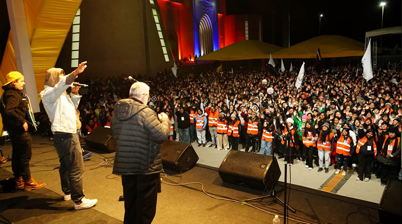 Concluido el tiempo de oración, hacia la medianoche comenzó el festival musical. Con su música católica urbana, el grupo "Estación Cero" conectó con los miles de jóvenes presentes, compartiendo con ellos canciones de alabanza y testimonios de fe. Después de una pausa, en la que nuestro Arzobispo fue saludando desde el estrado a las numerosas delegaciones de parroquias, colegios, universidades y movimientos, la fiesta continuó con la animación del Ministerio de Música de la Arquidiócesis. Así, hasta el amanecer los jóvenes disfrutaron de un ambiente de alegría y fraternidad. La música, los cantos y las danzas fueron una expresión de la fe viva de estos jóvenes que celebraron el amor de Dios y de la Virgen María.