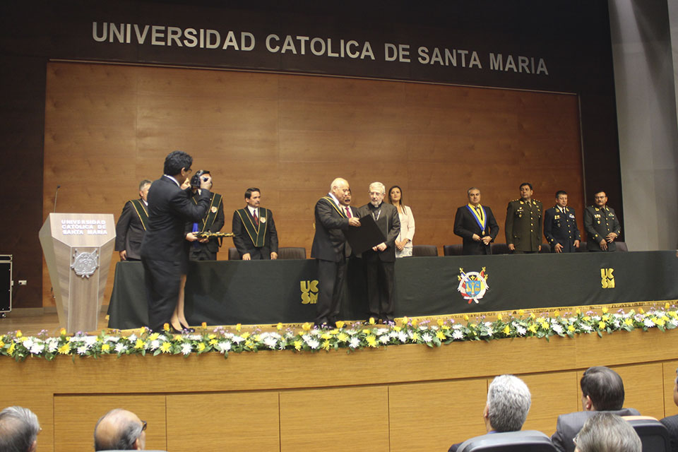 “Este reconocimiento lo hace nuestra comunidad universitaria a su gran labor con la juventud arequipeña y su labor pastoral, por lo cual decidió distinguirlo en esta importante ceremonia”, manifestó el rector de la casa santamariana, Dr. Manuel Alberto Briceño Ortega. Por su parte, en el discurso de agradecimiento, el Arzobispo manifestó que: “Agradecemos a Dios y a la Virgen María que este vínculo entre la Universidad y la Iglesia, se mantiene en estos años. La fe y la razón se necesitan mutuamente. Sin la razón la fe se limita a un simple sentimiento religioso y que peor aún puede derivar en fanatismo. Y la razón sin fe se limita a sí misma y no puede ir más allá de las propias limitaciones de orden natural. Por eso los animo a no tener miedo a poder contrastar la fe y la razón y seguir creciendo como comunidad universitaria que somos.”