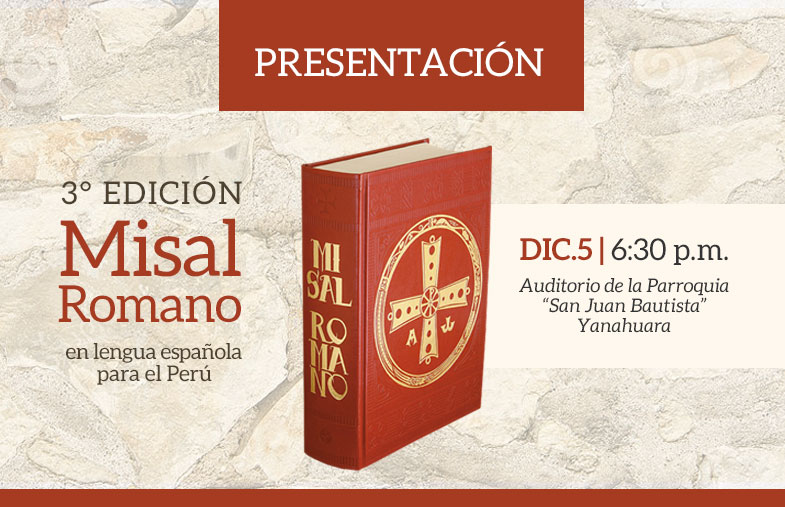 El próximo martes 5 de diciembre, se realizará la presentación de la tercera edición del Misal Romano que contiene algunas variaciones al modo en que hemos venido celebrando hasta ahora la Santa Misa, el cual entrará en vigencia con la nueva edición peruana a partir del primer domingo de Adviento. El encuentro se realizará en el auditorio de la parroquia «San Juan Bautista» en Yanahuara a partir de las 6:30 p.m.